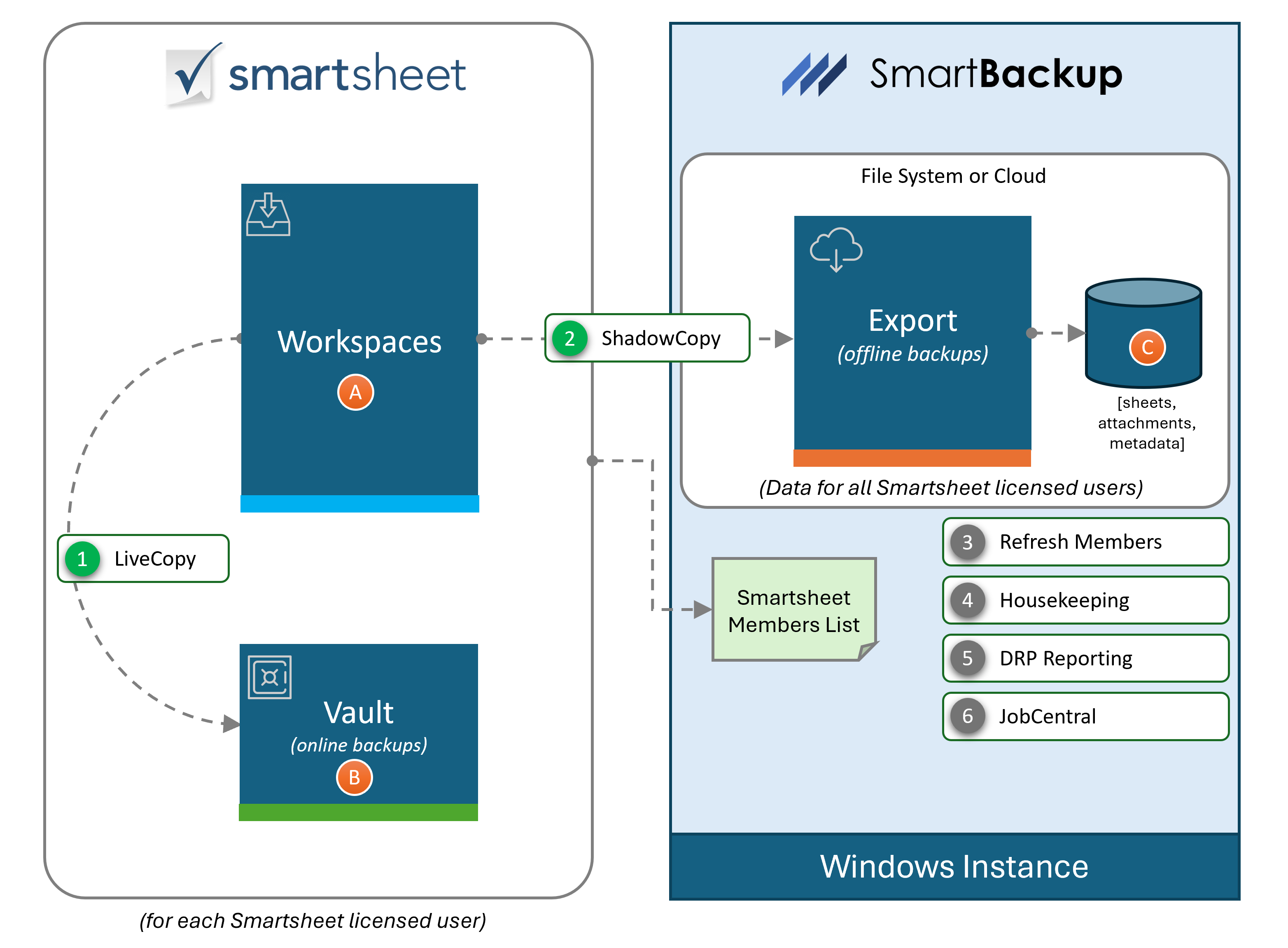 - ShadowCopy – When it runs, the ShadowCopy function identifies Sheets that meet the job criteria, and it creates offline backup copies of those Sheets and Attachments, together with all available "metadata", and saves them to the designated Export area, “C” on the Windows instance.