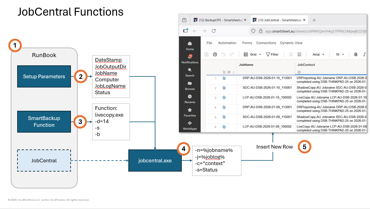 To better understand how these RunBooks work together with JobCentral to provide an overall monitoring and reporting solution for SmartBackup, it is necessary to take a look at the overall flow and coordination between the RunBooks, JobCentral and Smartsheet.