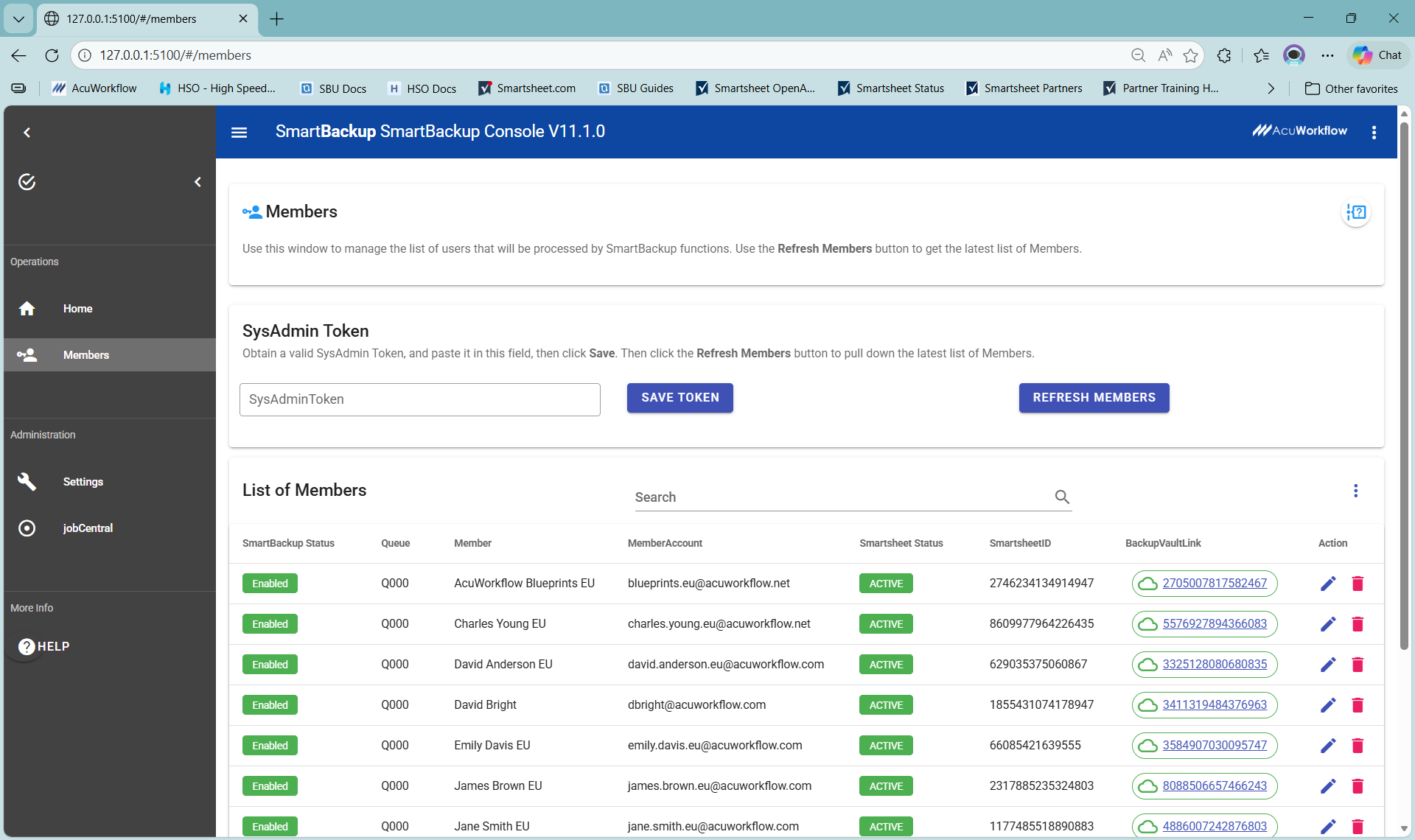 The Members view provides a list of all the Smartsheet Members that are currently defined, and which will be used to run all SmartBackup functions.