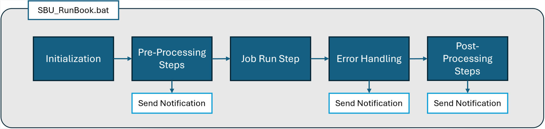 - Each RunBook will have an initialization section to define required parameters such as the Date/Time stamp, Job Name, Job Log Name and location, Computer name, Status, etc.