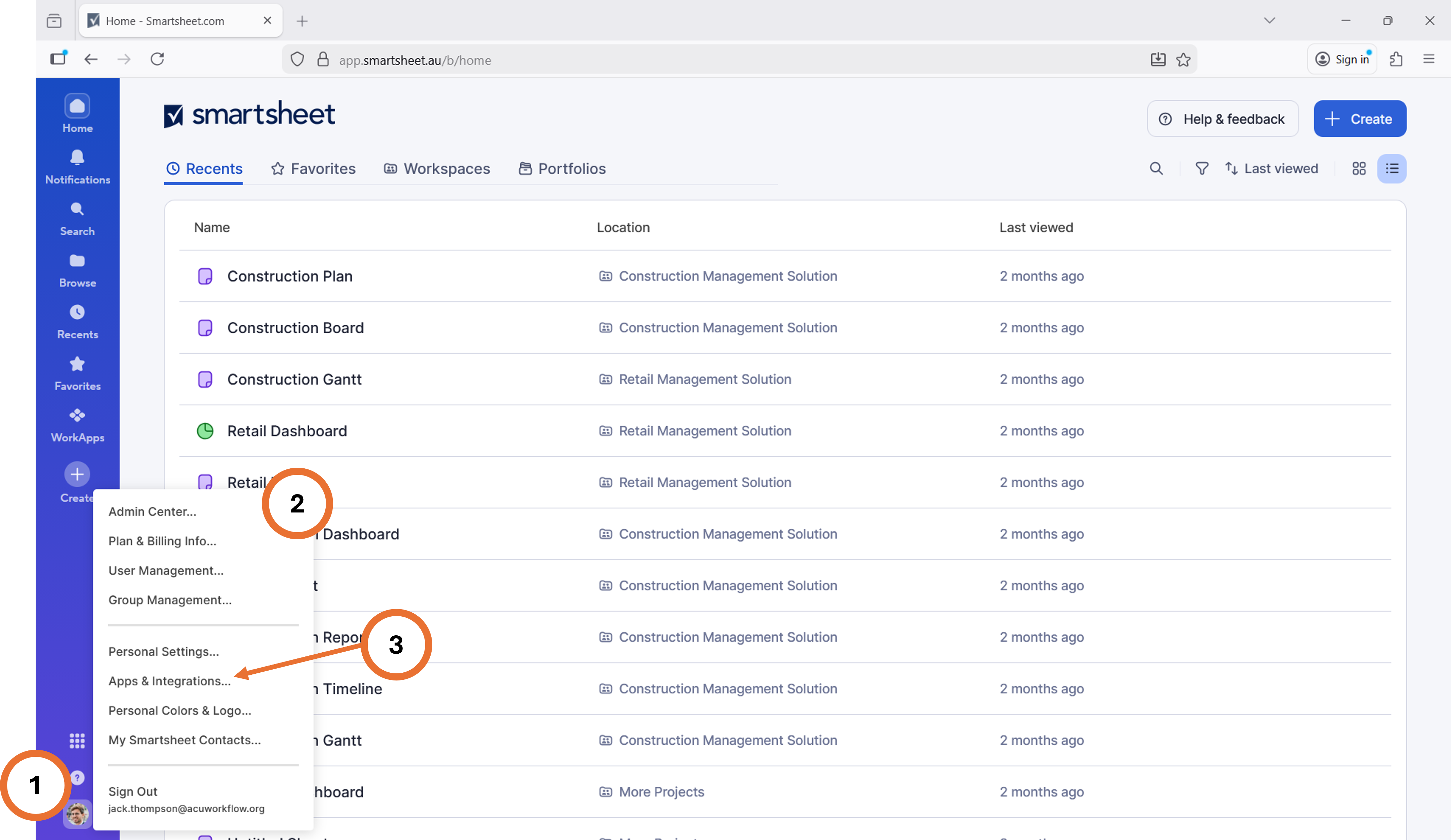 - Log into Smartsheet with an account that has Smartsheet Admin rights, then click on Profile button, usually bottom left.